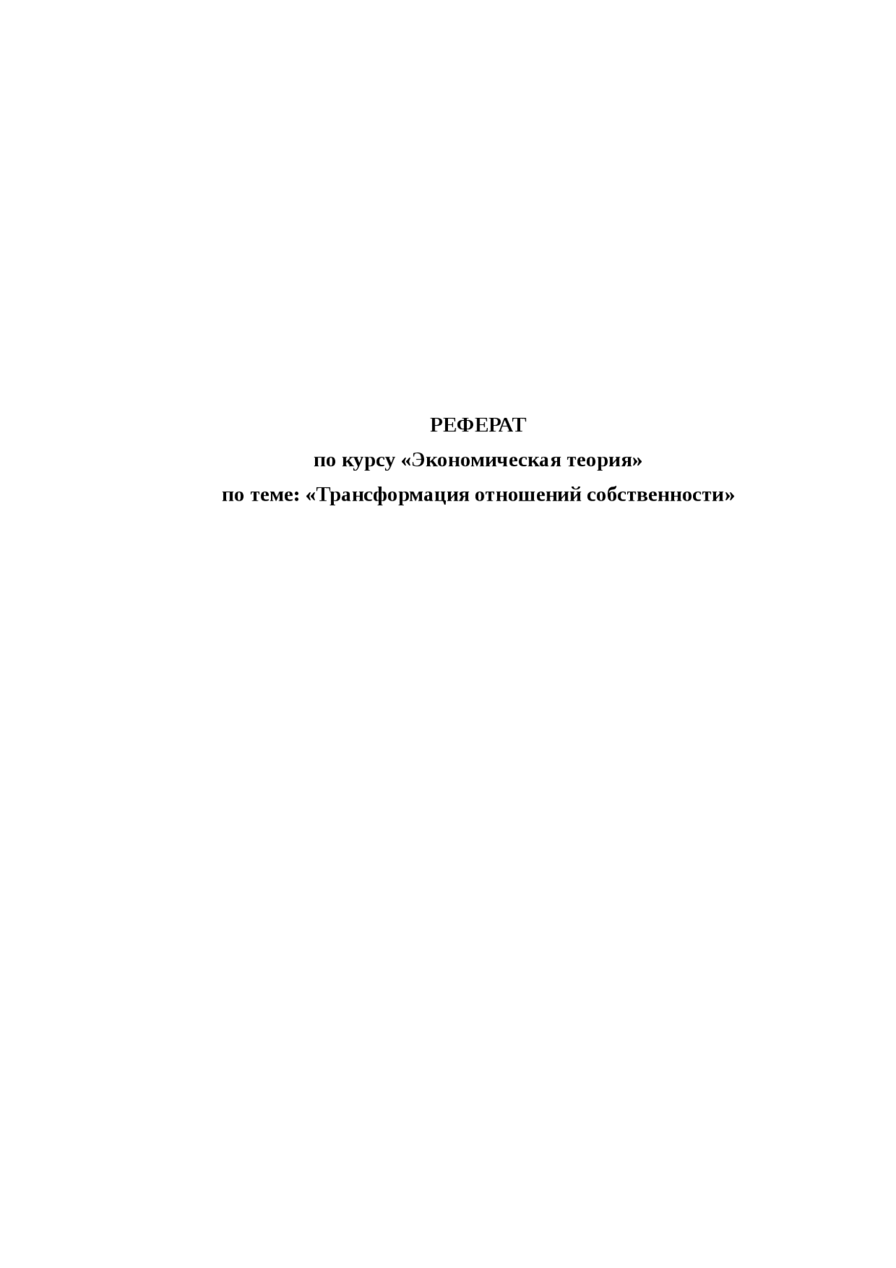 РЕФЕРАТ . по курсу «Экономическая теория» по теме: «Трансформация отношений собственности» 1 Трансформация отношений собственности как условие перехода к рыночной экономике