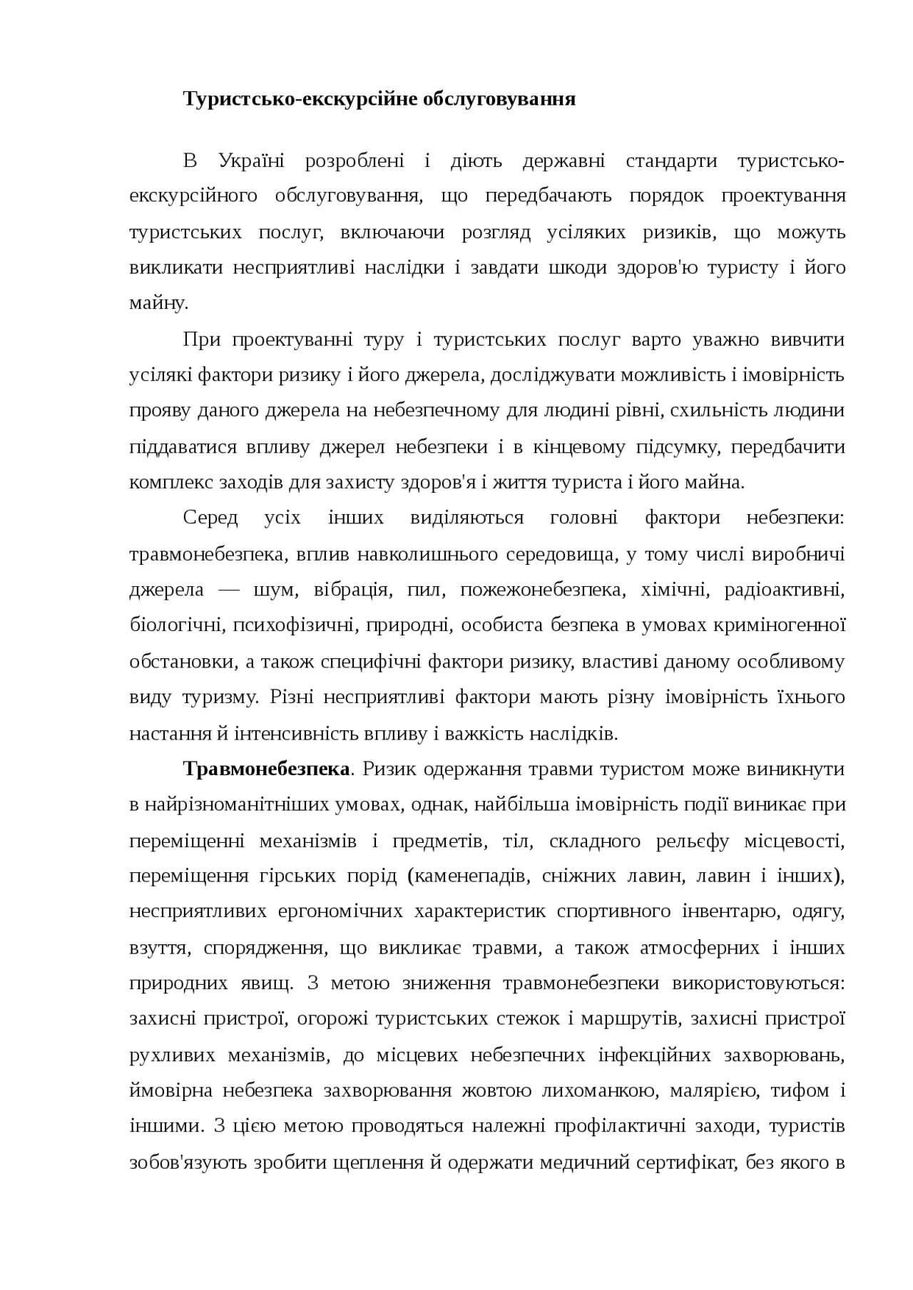 В Україні діє міждержавний стандарт (ГОСТ 28681 .1-95) "Туристично-екскурсійне обслуговування", який передбачає порядок проектування туристичних послуг, включаючи розгляд можливих ризиків, які можуть викликати негативні наслідки і спричинити шкоду здоров'ю туриста та його . . .