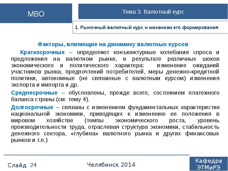 Валютные курсы и факторы, влияющие на их формирование . Факторы, влияющие на формирование валютного курса рубля, можно разделить на три группы . 2 Факторы, влияющие на величину валютного курса . На валютный курс влияют следующие факторы . К конъюнктурным факторам, влияющим . . .