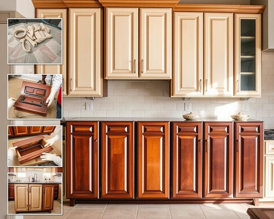 Learning cabinet refinishing steps takes patience and care. Start by sanding kitchen cabinets with 120-grit sandpaper. Then, use 220-grit for a smooth finish. Clean off dust with a tack cloth before you go on.