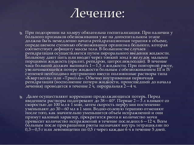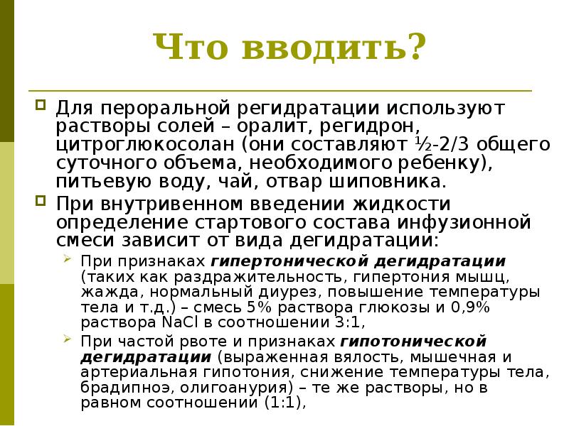 Все способы регидратации, то есть восполнения жидкости, можно разделить на оральные и инфузионные (внутривенные) . Оральная регидратация, при которой необходимо пить очень часто и маленькими глотками, возможна при начальных стадиях обезвоживания, а также при отсутствии рвоты .