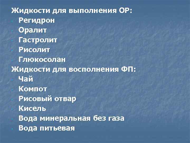 «Регидрон» и «Оралит» Эти медикаменты используются для восстановления водного баланса и защиты ребенка от обезвоживания, применяются перорально . Для лечения следует одну дозу регидрона или оралита развести в литре чистой кипяченой воды, для детей после трех лет можно разводить в фильтрованной .