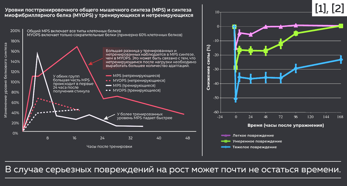 Мы помним: мышцы растут лучше, когда повреждаются меньше. Перед тем, как строить новые структуры, нужно «залатать раны». Синтез белка после тренировки остается повышенным недолго. При значительных повреждениях на рост может остаться совсем немного времени.