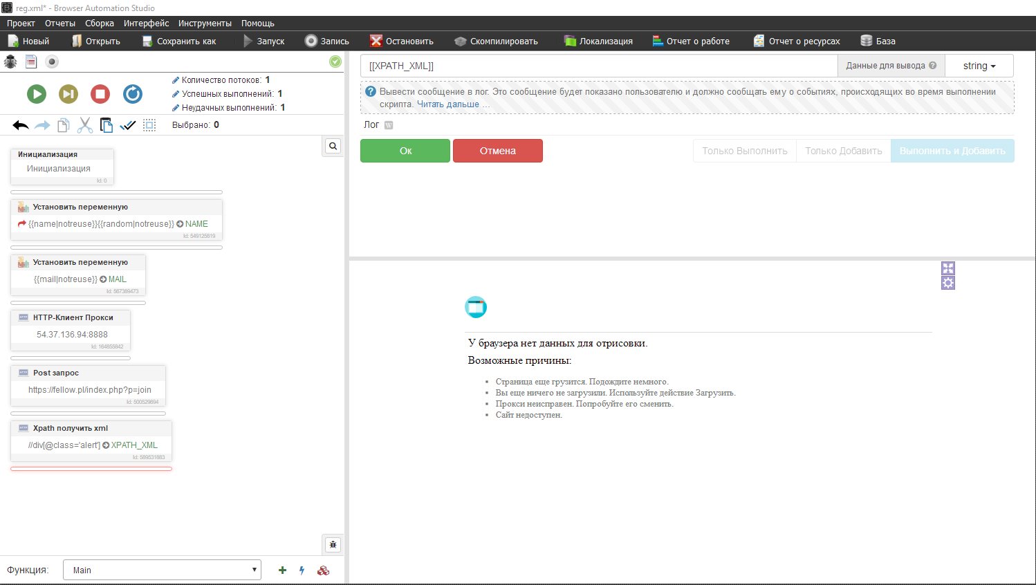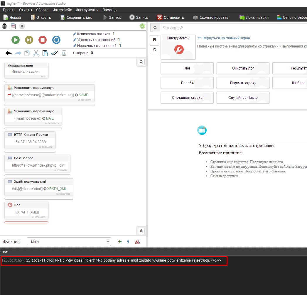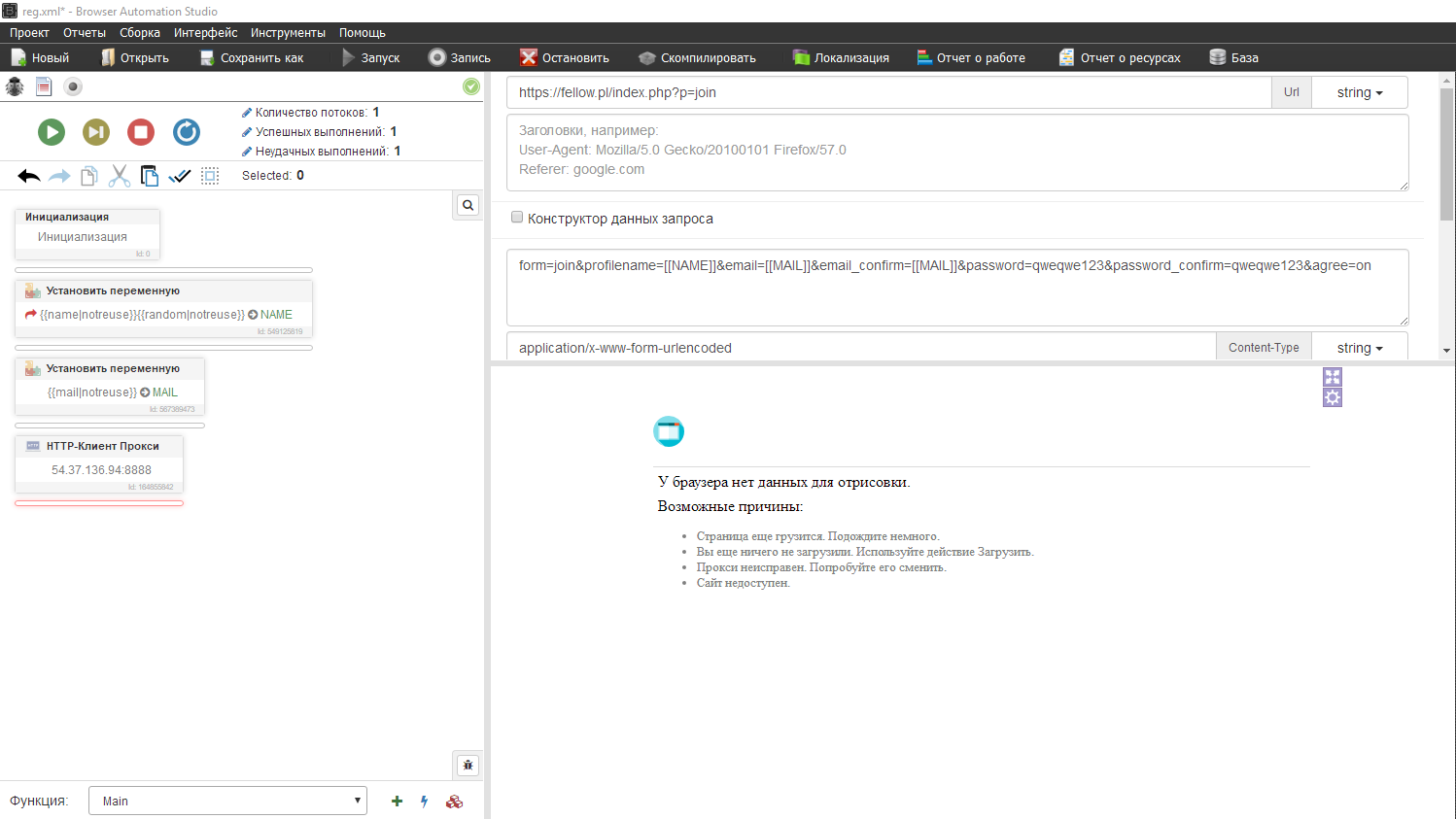 Исток польский, есть ограничение по странам, подключаем прокси, хттп клиент прокси, я добавлю один, если хотите работать с прокси листом, делаем аналогично мейлам и именам - ПЕРЕМЕННЫЕ