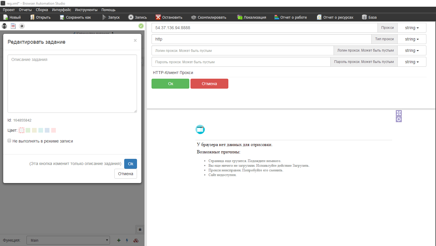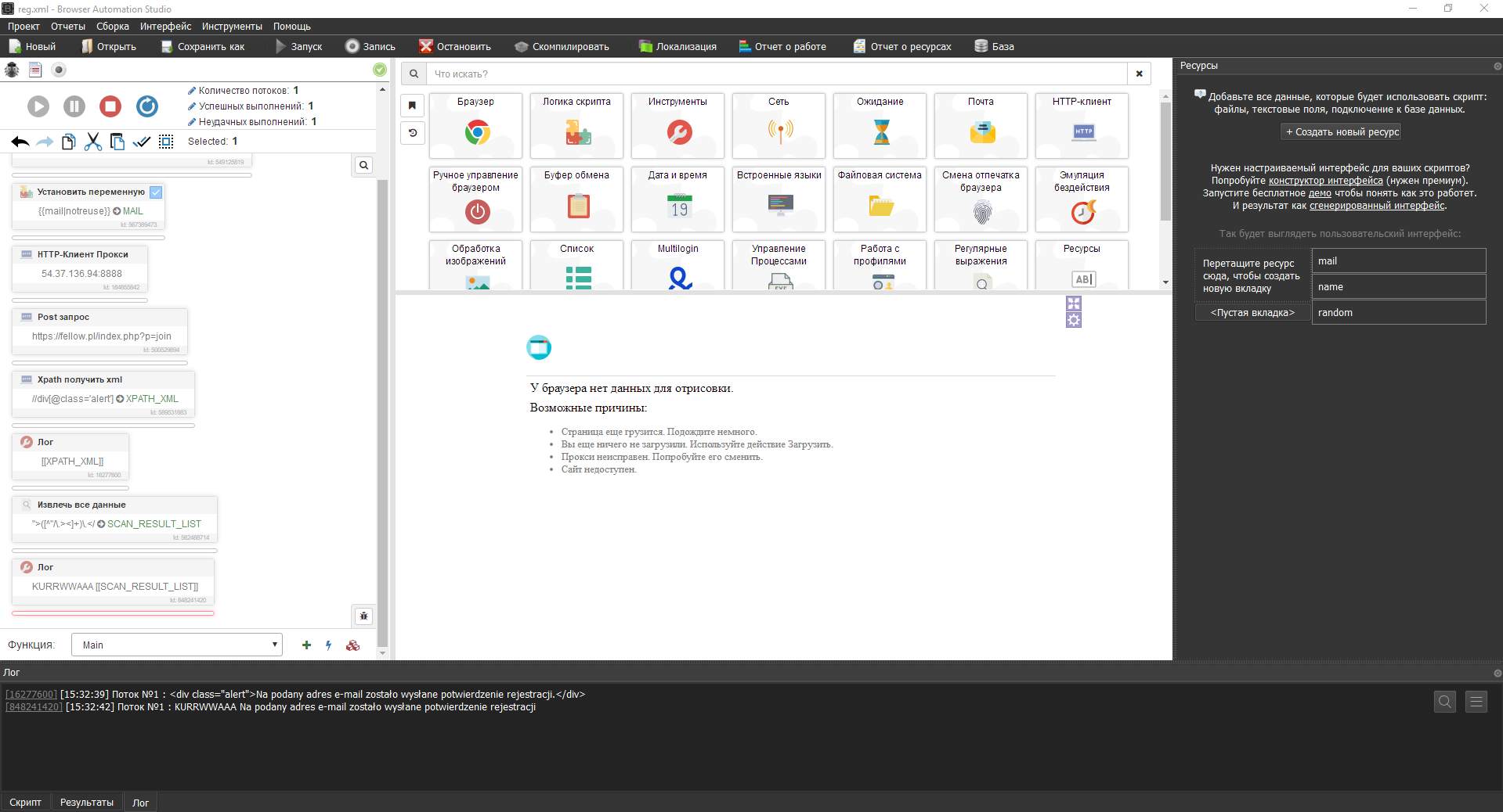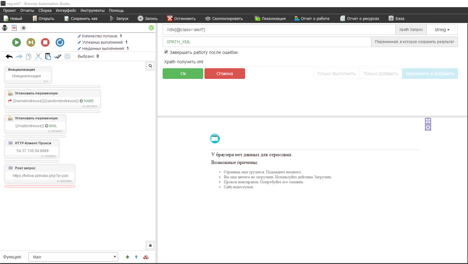 Исток польский, есть ограничение по странам, подключаем прокси, хттп клиент прокси, я добавлю один, если хотите работать с прокси листом, делаем аналогично мейлам и именам - ПЕРЕМЕННЫЕ