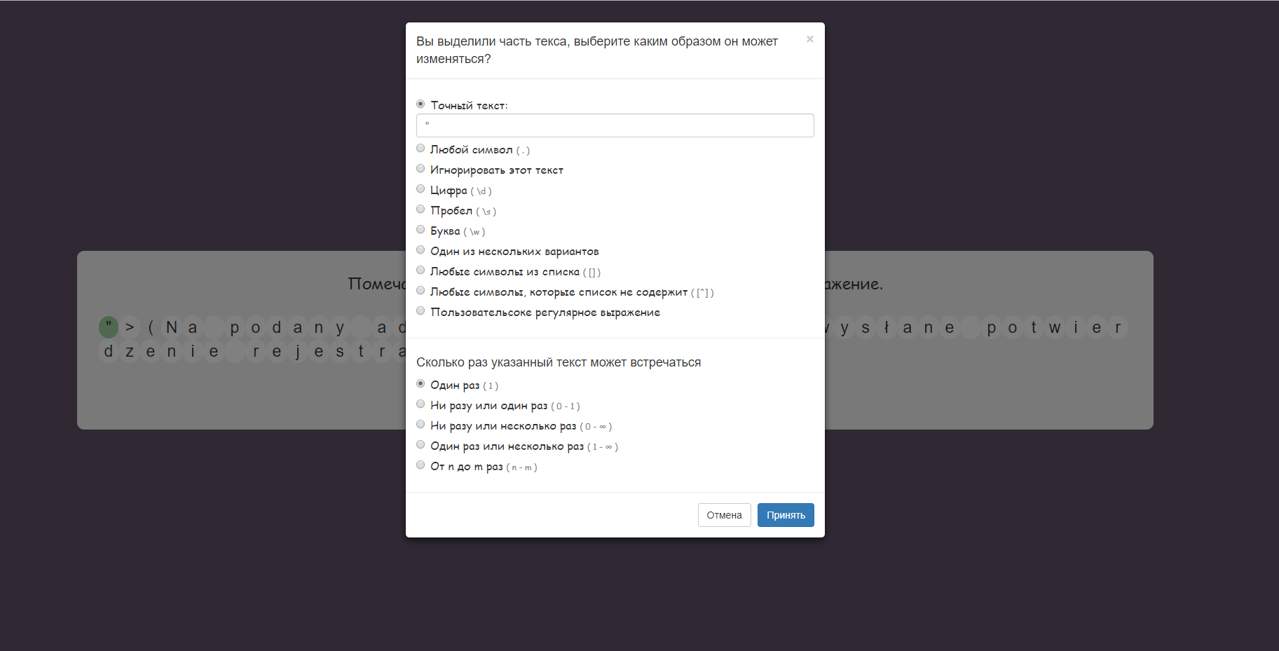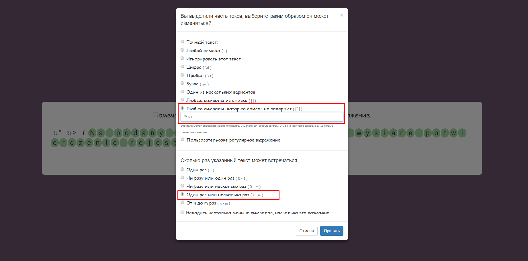 Остался результат, выделяем его полностью, текст встречается "Один раз или несколько раз" и это "Любые символы которые список не содержит" в этом поле мы вписаваем символы которые выделяли до этого, которые встречаются только один раз. Нажимаем принять и дальше
