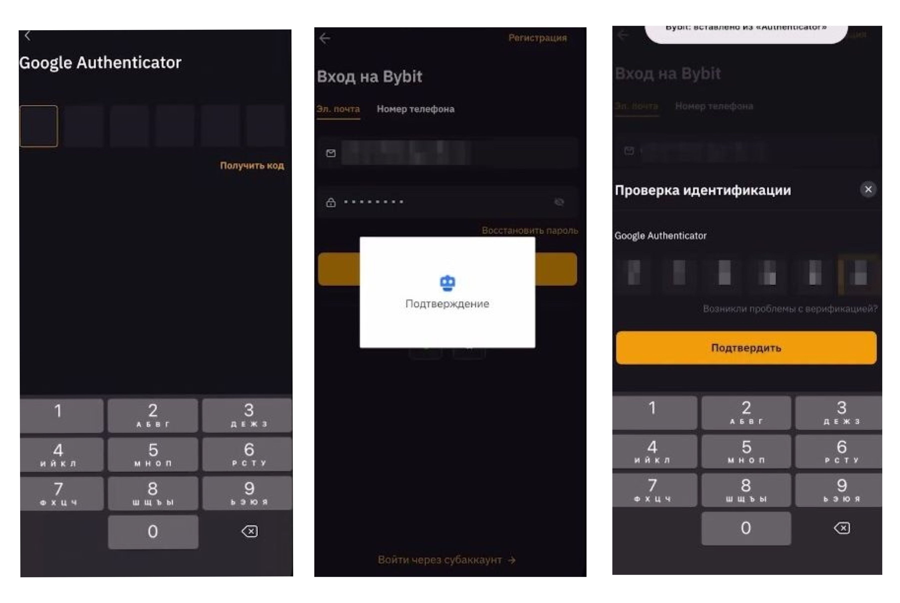 Авторизуйтесь в аккаунте BYBIT (логин/пароль). Снова вставьте свой Google Authentication (скопировали, он автоматически вставляется в окошки) -> нажмите Подтвердить.