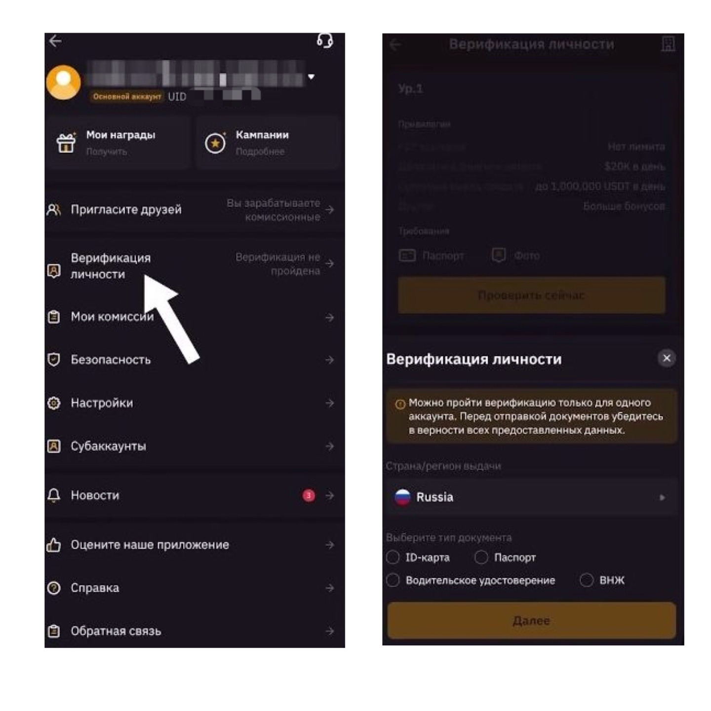 Нажмите "Верификация личности" -> нажмите Проверить сейчас -> выберите Страну (свою) -> выберите тип документа для подтверждения личности -> нажмите Далее (прочитайте требования для документа) -> нажмите Далее и следуйте инструкции. В течение 5 мин. ваш документ проверят и одобрят верификацию.