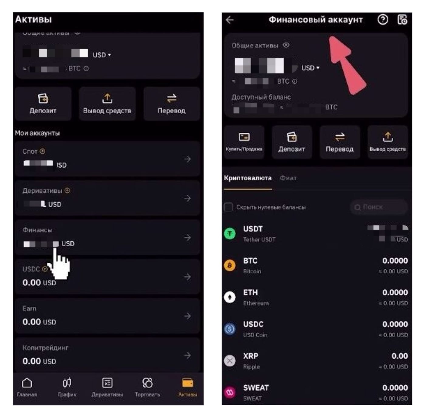 Внизу экрана в меню нажмите "Активы" -> далее "Финансы" - здесь появится ваша криптовалюта: