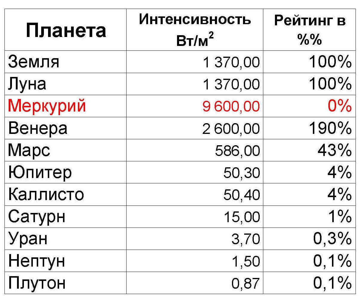 В данной оценке для Меркурия я поставил «0%», так как интенсивность потока излечения в его зоне слишком велика.