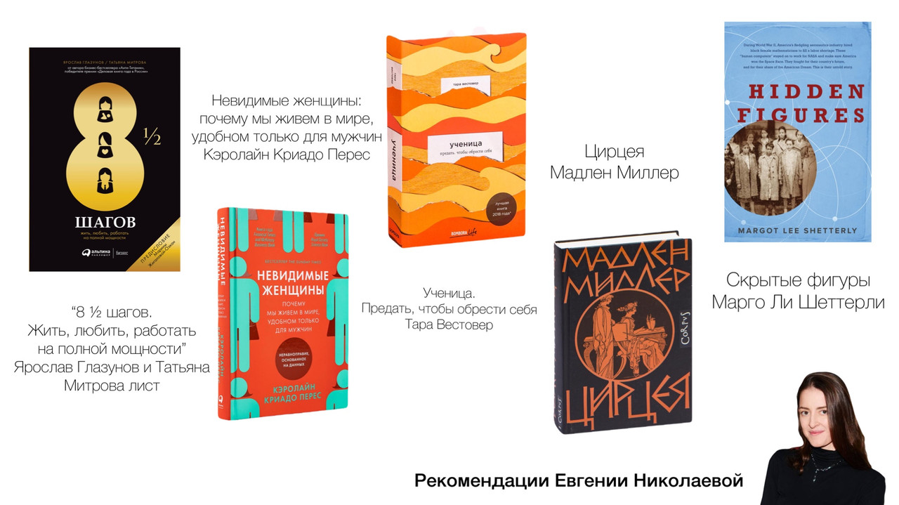 Евгения – человек, который умеет видеть тренды, выстраивать процессы и находить баланс между работой, AI-технологиями и личной жизнью. В своём канале «Артикулируй ртом» она говорит о бизнесе, командах, фишках AI и том, как совмещать все свои роли, включая маму. В этой подборке Евгения собрала книги, которые помогают понять женский опыт во всех его проявлениях: от борьбы за место в мире до поиска внутренней силы.