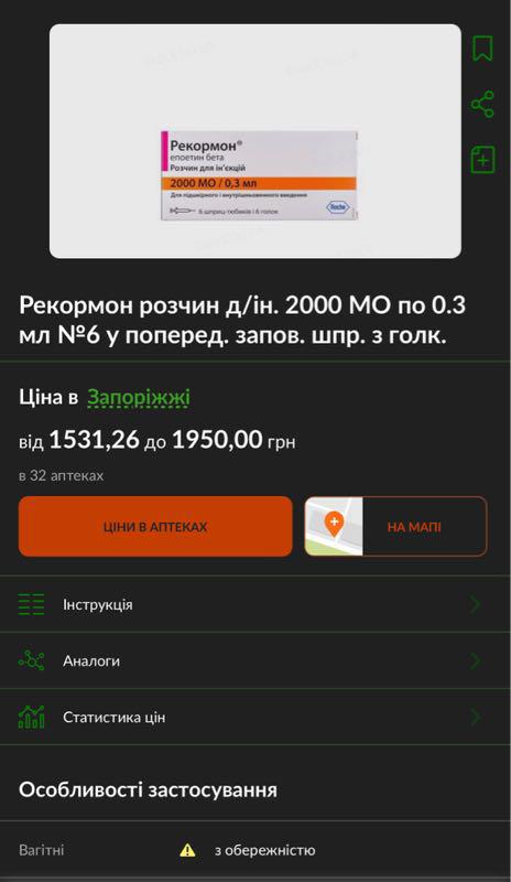 Аналог по составу и показанию . 1690 руб . 1716 грн . 5 . Эральфон альфа эпоэтин . Аналог по составу и показанию . 1720 руб . 1673 грн . При расчетах стоимости дешевых аналогов Рекормон учитывалась минимальная цена, которая была найдена в прайс листах предоставленных аптеками .