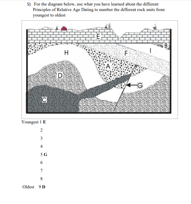 Clues to Earth's Past Name Date Class LESSON 2 . Relative-Age Dating . Directions: Use your textbook and the diagram to answer each question or respond to each statement . 1 . List . the rocks in order from oldest to youngest . 2 . How did you determine the relative age of Rock A? 3 . Which rock contains inclusions? Explain . how they formed . 34