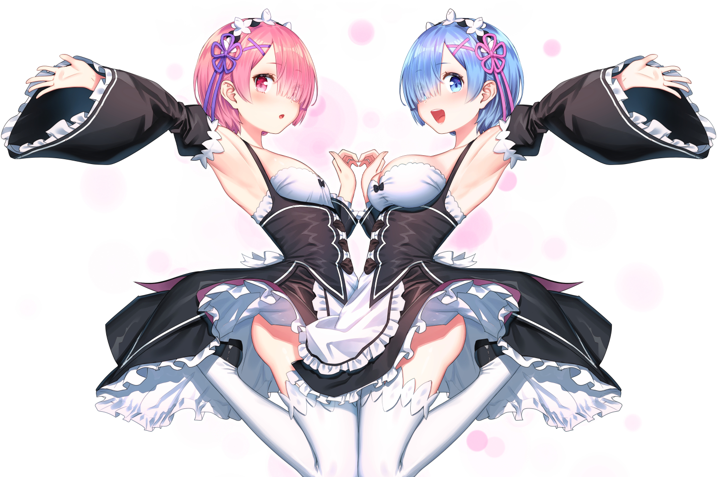 proactive, lifeguard, open arms, sea rescue, winter guard, life guard, red guard, coclor guard, world, 2021, trendy, popular, anime, anime girl, big boobs, cute, sexy, rem, re zero kara hajimeru isekai seikatsu, re zero, 1girl, apron, armpits, arms up, black ribbon, black, blue eyes, sleeves, frilled, frills, hair between eyes, hair ornament, holding, horn, maid, medium breasts, neck ribbon, no shoes, ribbon trim, short hair, sitting, solo, thighhighs, wariza, whale, white apron, white background, white legwear