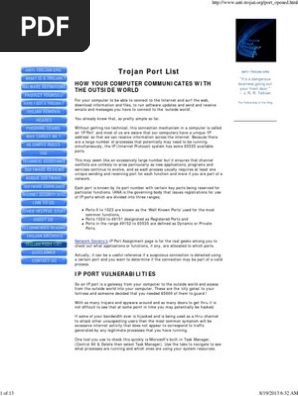 For reference, the port numbers are shown as ":XXXXX" to the right of the IP address, where "XXXXX" is a 1 to 5 digit number _____ The following ports used In the default configurations of Trojans: Back Orifice - UDP port 31337 or 31338 Deep Throat - UDP port 2140 and 3150 NetBus - TCP port 12345 and 12346 Whack-a-mole - TCP port 12361 and . . .
