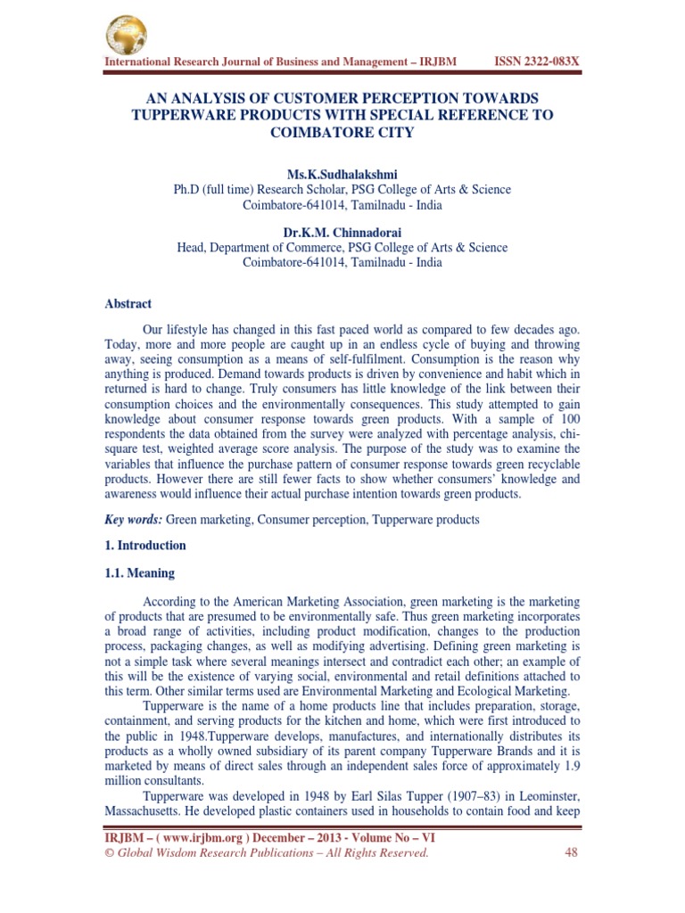International Research Journal of Business and Management . . . Tupperware is the name of a home products line that includes preparation, storage, . . . et al ., (1998)2 In the paper titled "Developing Green Products: Learning from Stakeholders "discussed the research which focused on US and Australian markets' perceptions of