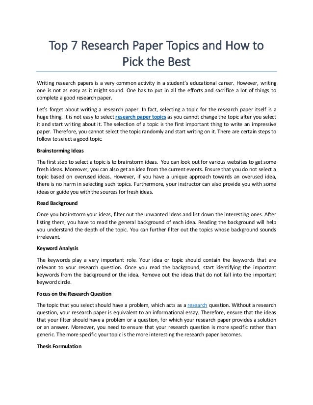200 Most Brilliant Research Paper Topics This article's title promises to give you a list of the best research topic ideas, but only you decide what the best for you is . However, feel free to use any of the suggested topics and make your academic text striking . Easy Research Paper Topics . The origins of Instagram; The rise of Marvel movies