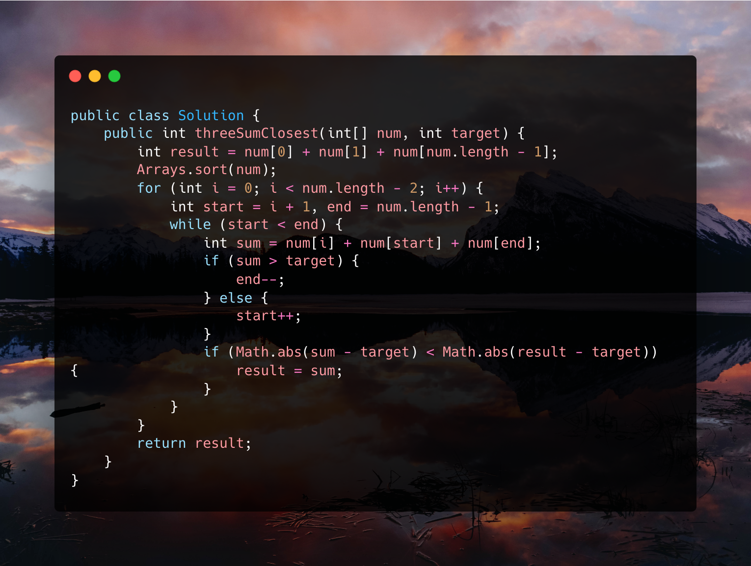 Подобно задаче 3 Sum, используйте 3 указателя, чтобы указать на текущий элемент, следующий элемент и последний элемент. Если сумма меньше целевой, это означает, что мы должны добавить элемент большего размера, чтобы следующий элемент перемещался к следующему. Если сумма больше, это означает, что мы должны добавить меньший элемент, чтобы последний элемент переместился на предпоследний элемент. Продолжайте делать это до конца. Каждый раз сравнивайте разницу между суммой и целью, если она меньше минимальной разницы на данный момент, замените результат на нее, в противном случае продолжайте итерацию.