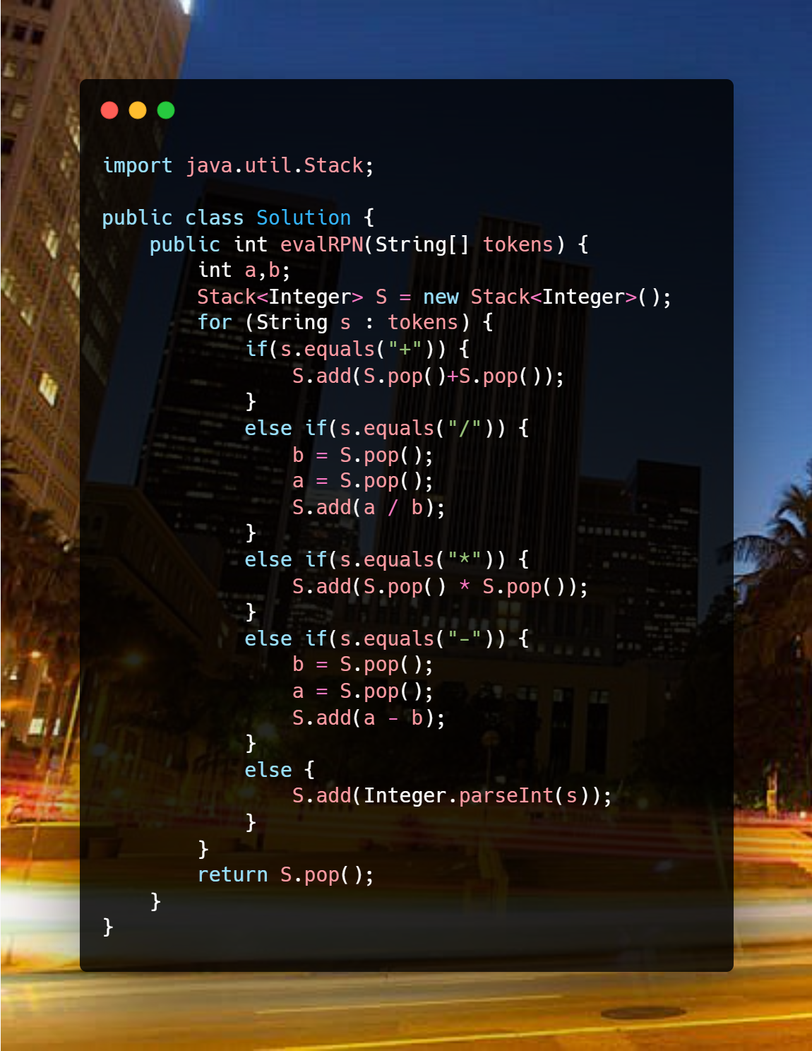Обратная польская нотация — это стек операций, поэтому для решения этой проблемы я решил использовать java.util.Stack. Как видите, я добавляю каждый токен в стек как целое число, если только это не операция. В этом случае я извлекаю два элемента из стека, а затем сохраняю результат обратно в него. После того, как все операции будут выполнены, результатом будет оставшийся элемент в стеке.