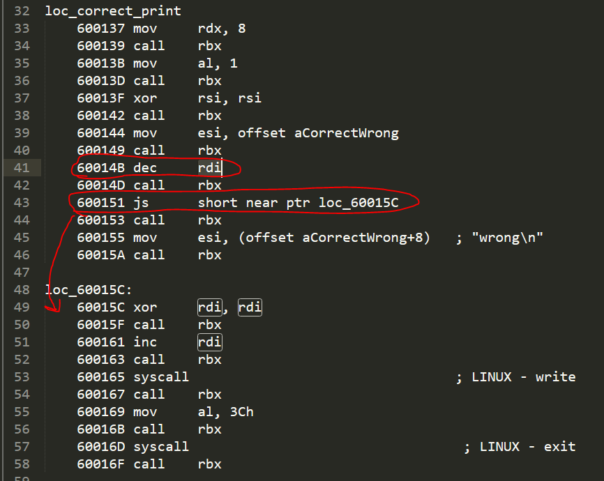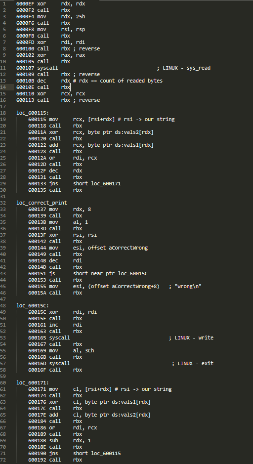 В начале мы читаем 0x25 символов с клавиатуры с помощью системного вызова read. После этого мы попадаем в цикл с двумя простыми шагами.