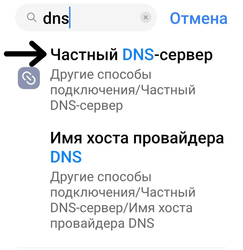 4. Перейдите в настройки телефона, затем напишите в поиске dns и перейдите во вкладку "Частный DNS-сервер"