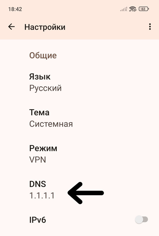 7. В настройках нужно изменить значение DNS на 1.1.1.1, а так же обратите внимание на режим, он должен быть VPN