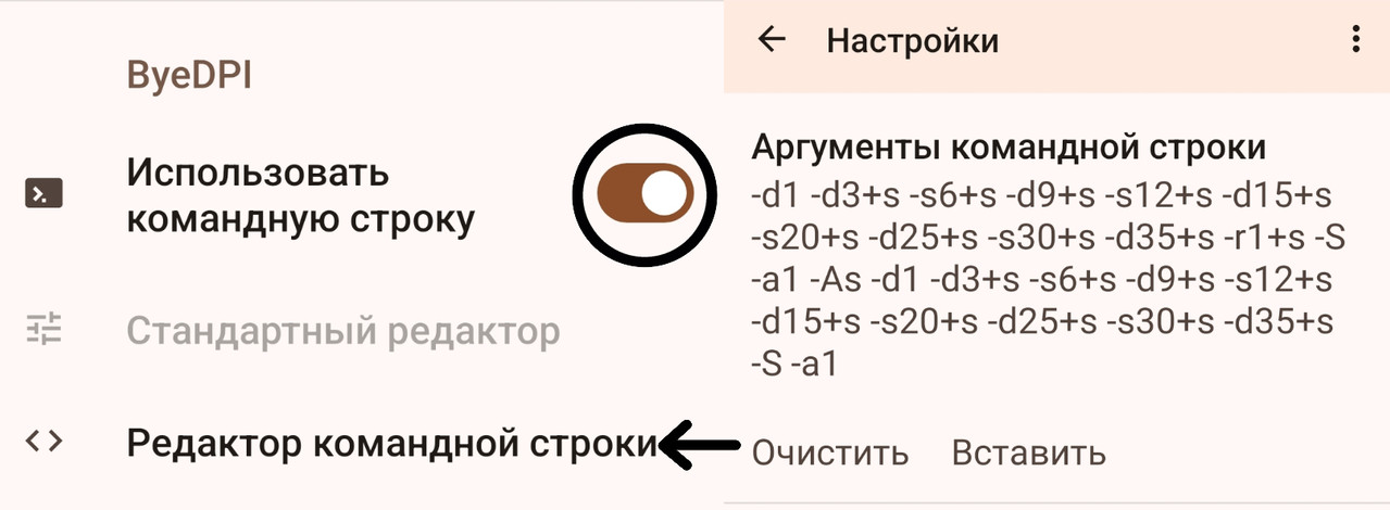 8. Так же пролистав ниже, включите функцию "Использовать командную строку", затем перейдите в редактор командной строки. В аргумент командной строки введите текст: -d1 -d3+s -s6+s -d9+s -s12+s -d15+s -s20+s -d25+s -s30+s -d35+s -r1+s -S -a1 -As -d1 -d3+s -s6+s -d9+s -s12+s -d15+s -s20+s -d25+s -s30+s -d35+s -S -a1