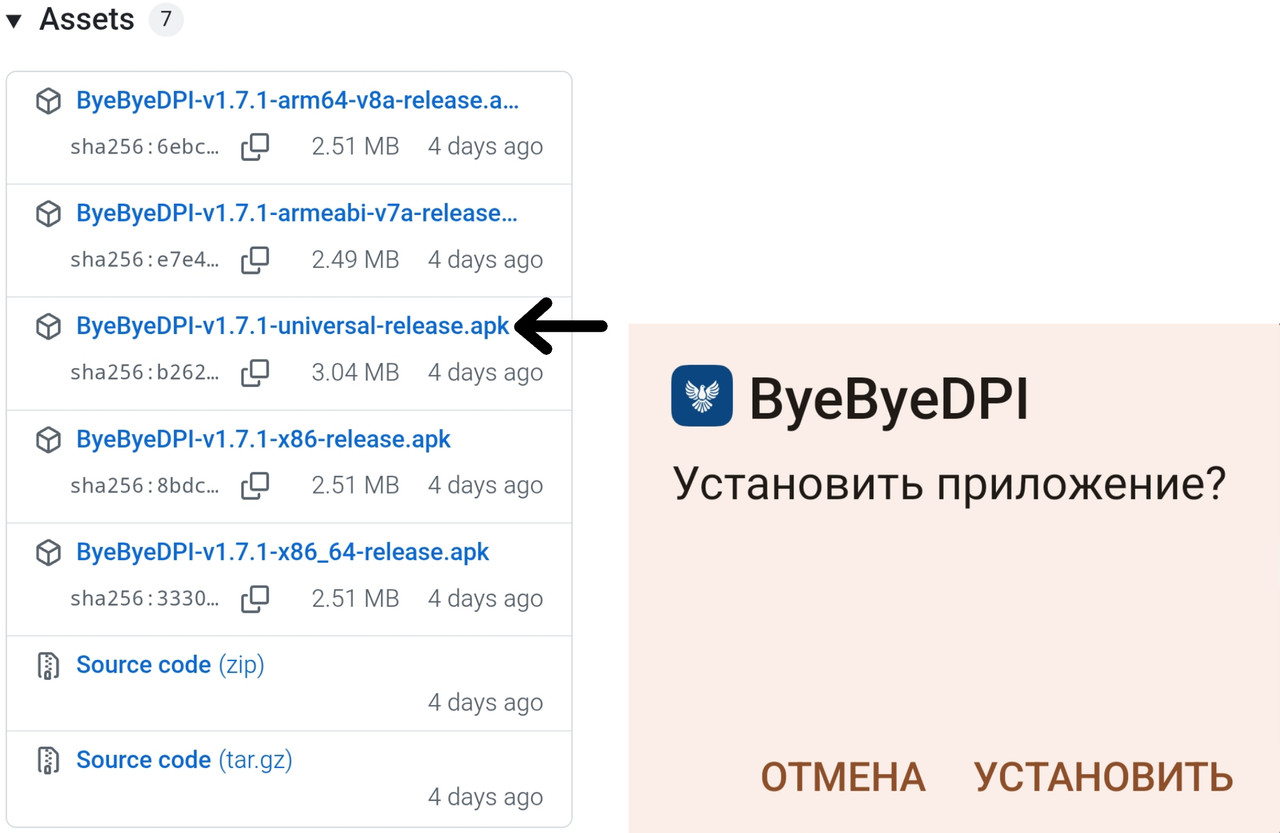 2. Скачайте программу ByeByeDPI, нажав на “ByeByedpi-v1.7.1-universal-release.apk”, а затем, установите ее