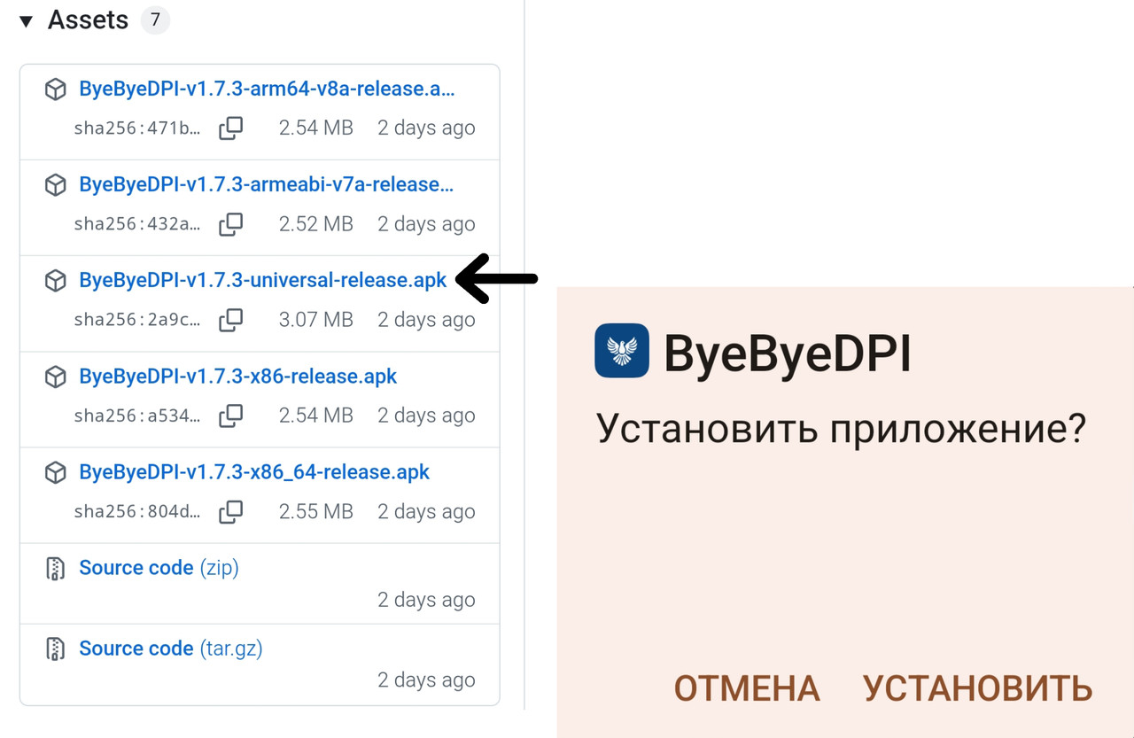2. Скачайте программу ByeByeDPI, нажав на “ByeByedpi-v1.7.3-universal-release.apk”, а затем, установите ее