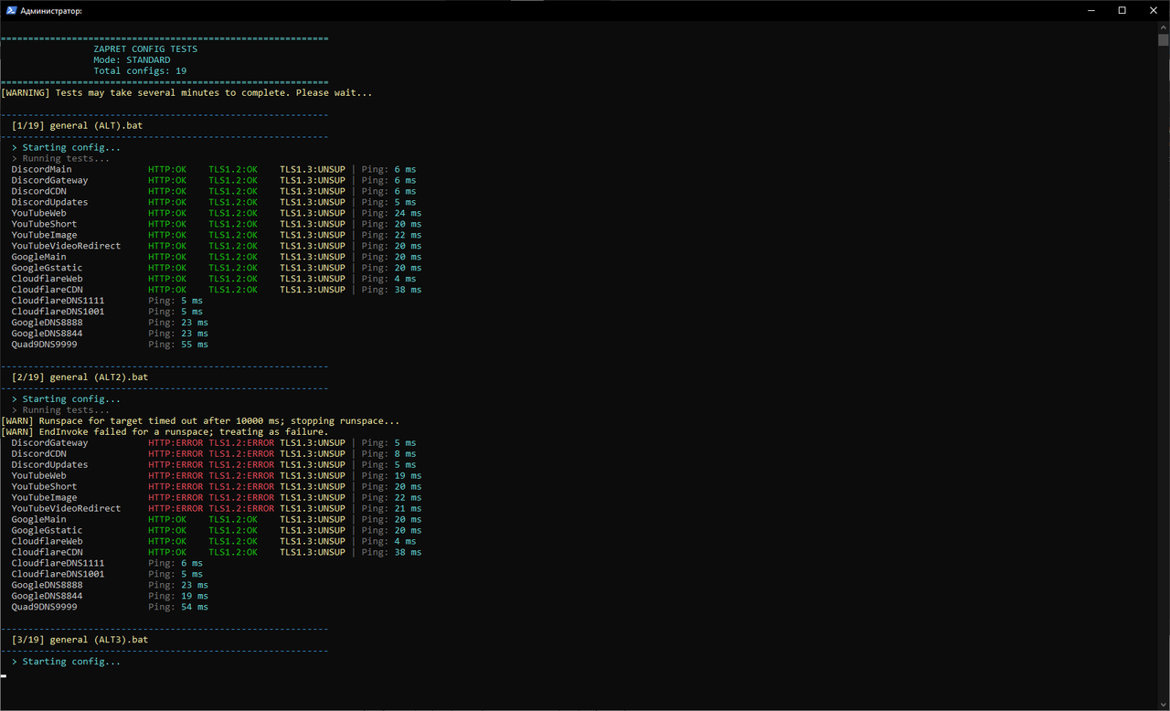 3. Скрипт автоматически протестирует все конфигурации с названием "general" и выберет наиболее подходящую для вашего провайдера