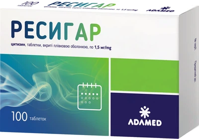 Лекарственные препараты Ресигар (Resigar) Ресигар (Resigar) Производитель: ADAMED PHARMA S .A Состав и форма выпуска таблетки, покрытые пленочной оболочкой 1,5 мг блистер, № 100 Цены в аптеках Можно оплатить лекарства картой підтримка Классификация Лекарственные средства N07B A04 Цитизиниклин Активное вещество CYTISINUM* (ЦИТИЗИН*)