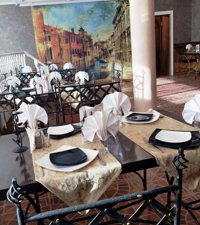 В ресторане есть как общий зал, так и Vip-залы на 10 и 25 человек . В теплое время здесь открывают летнюю террасу . С 12:00 до 15:00 подают бизнес-ланчи .