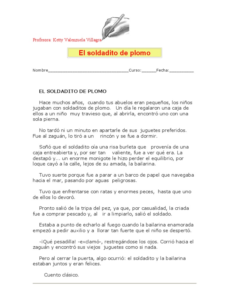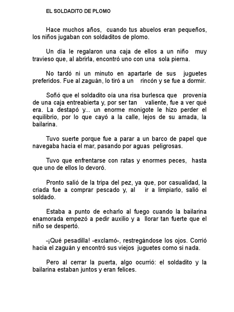 EL SOLDADITO DE PLOMO Hace muchos años, cuando tus abuelos eran pequeños, los niños jugaban con soldaditos de plomo . Un día le regalaron una caja de ellos a un niño muy travieso que, al abrirla, encontró uno con una sola pierna . No tardó ni un minuto en apartarle de sus juguetes preferidos . Fue al zaguán,…