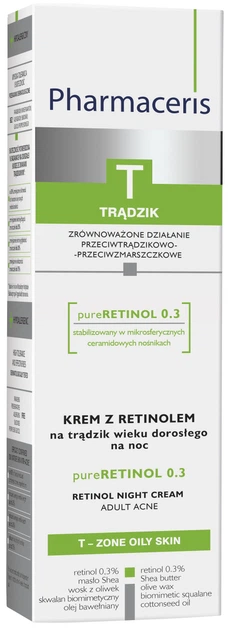 Крем с ретинолом Pharmaceris T pureRetinol 0,3 обеспечивает ежедневный ночной уход за кожей взрослых . Уменьшает недостатки и акне, одновременно предотвращая образование морщин .
