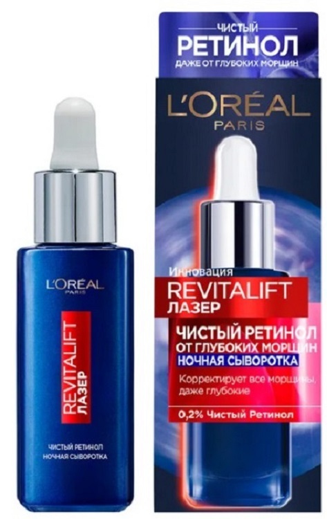 «Revitalift Лазер Ночная сыворотка, 0,2% чистый ретинол от всех видов морщин» Как видно из названия, сыворотка из популярной линейки «Revitalift Лазер» содержит ретинол в концентрации 0,2% — такого количества вполне хватает, чтобы обеспечить мощный антивозрастной эффект .