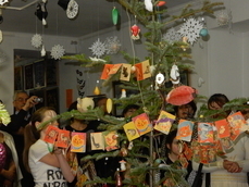 Для Нового года подойдет сочетание черного и золотистого - шары, атласные ленты, композиции со свечами, фарфоровые статуэтки, посуда с новогодними рисунками .