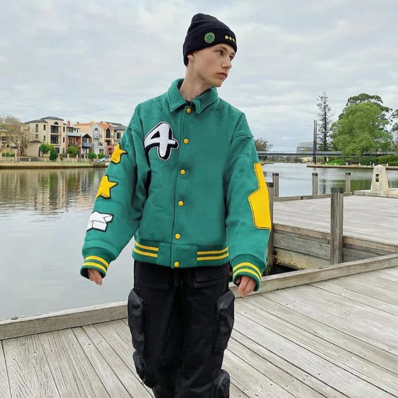 "Retro Green Baseball Uniform Men and Women Autumn and Winter High Street Bomber Jacket Tooling Jacket Winter Jacket Men Korean" * Buy Now Just For 75$