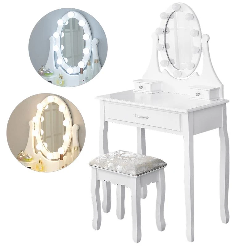 Simple and stylish crystal handle and square mirror design, beautiful and practical dressing table is a solid furniture in your bedroom , bathroom or corridor . After removing the top of the mirror , the makeup table can be used as a writing desk or a laptop table .This excellent dressing table has 10 LED lights with unlimited adjustable brightness .