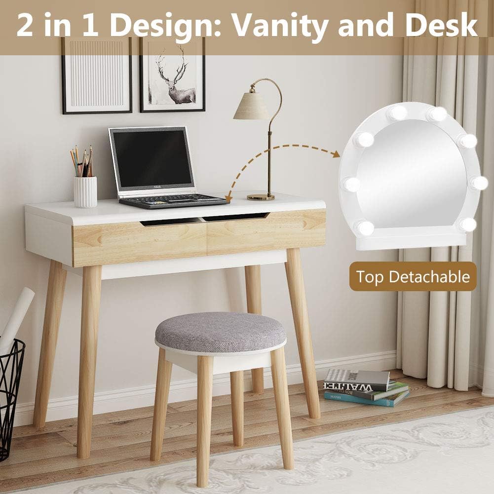 The solid wood framework includes one desk with two drawers and one cabinet, one makeup stool with a soft cushion, and one HD mirror .The vanity table as a whole presents the minimalist style of nordic luxury, clear lines, and excellent quality, adding a bit of nobility to your bedroom .We want to give you the best vanity dressing tableA Dressing . . .