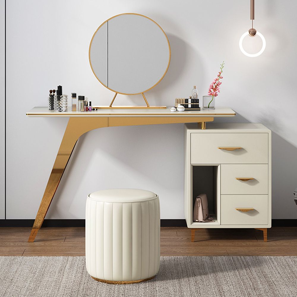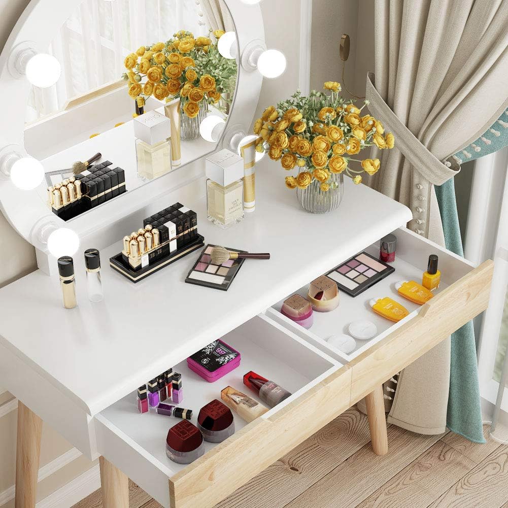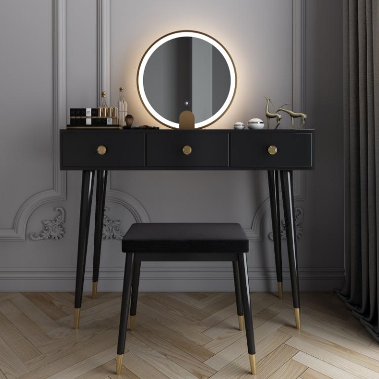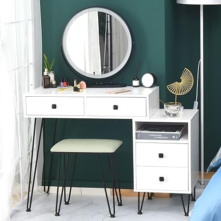 It's a modern dressing table with a beautiful big mirror and LED lights . The circular mirror and elegant white look perfectly match your other furniture . This dresser is made of high-quality material . Density board paint and solid wood legs make the dressing table stable and durable .