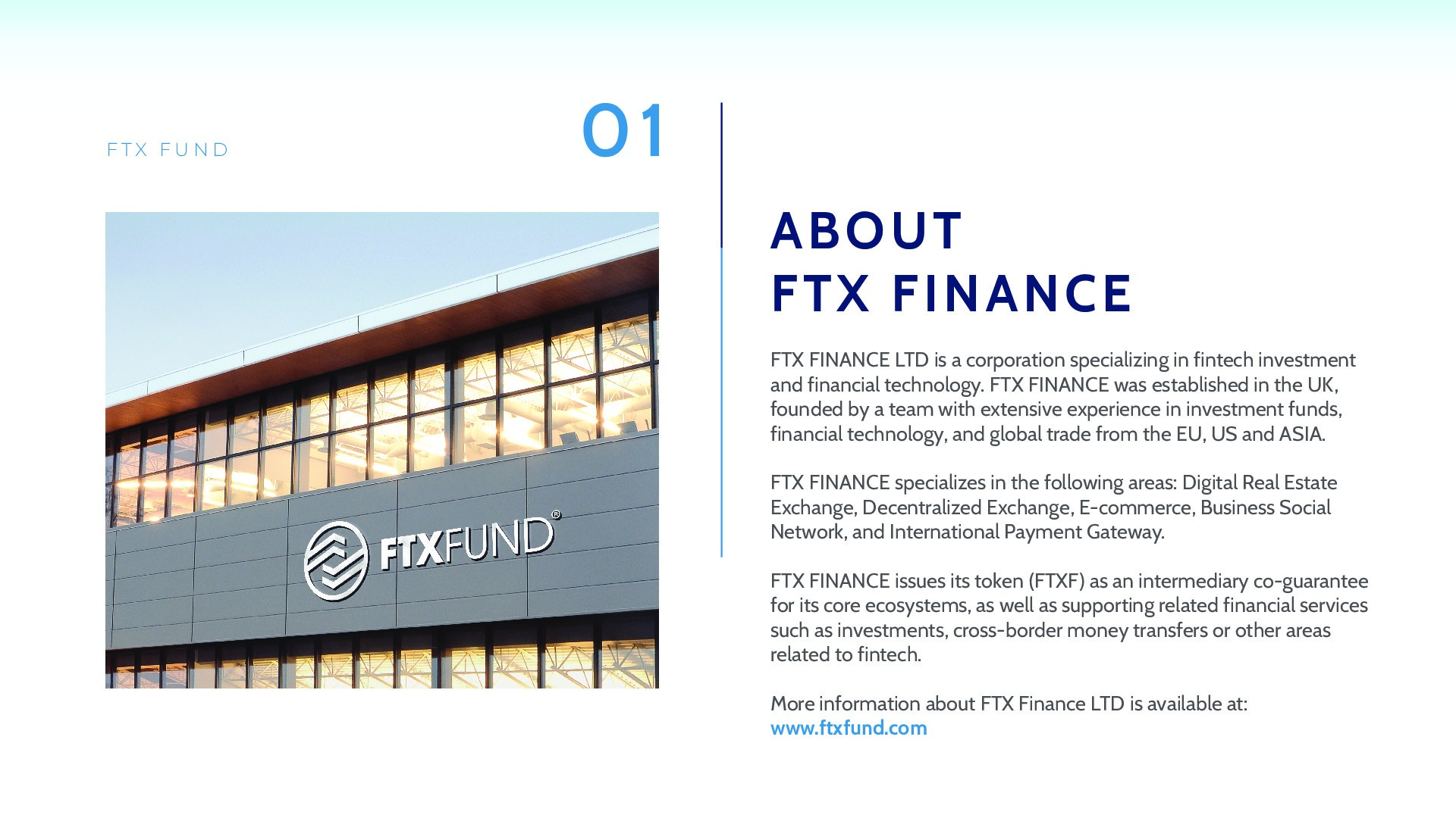 FTX Fund is a blockchain platform under FTX Finance LTD that was born with the mission of creating a giant platform in the blockchain industry. FTX FINANCE specializes in the following areas: Digital Real Estate Exchange, Decentralized Exchange, E-Commerce, Business Social Network and International Payment Gateway.