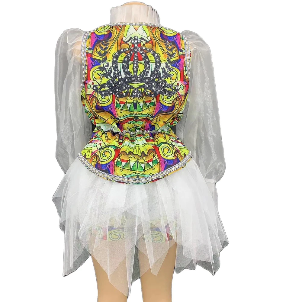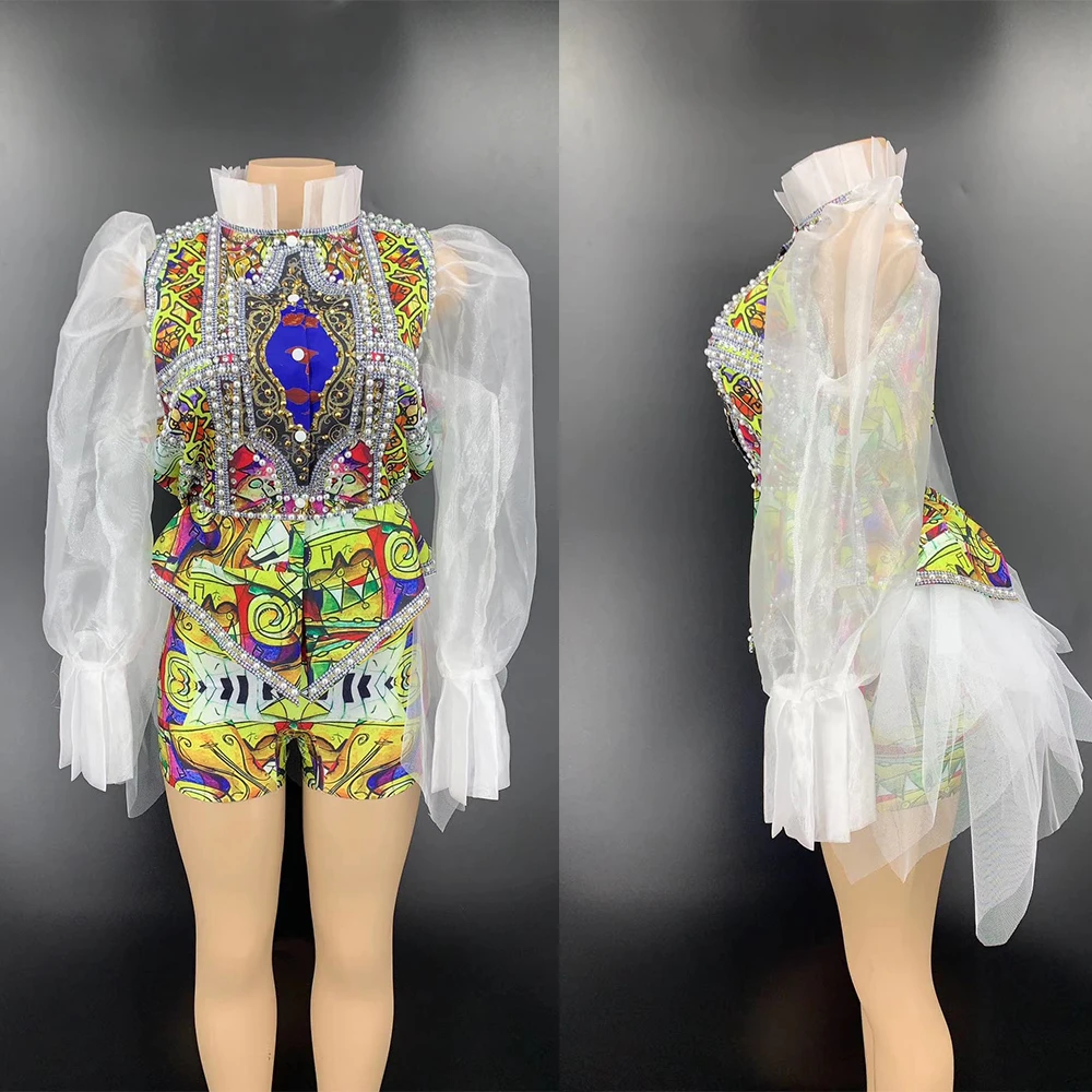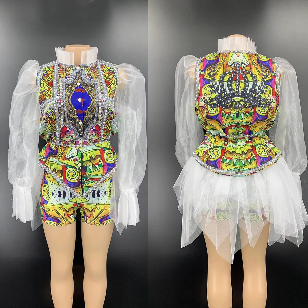 "Rhinestones Pattern Printing Three-Piece Suit Theatrical Costume Women Puff Mesh Sleeve Coat Trailing Decoration Tight Shorts" * Buy Now Just For 84$