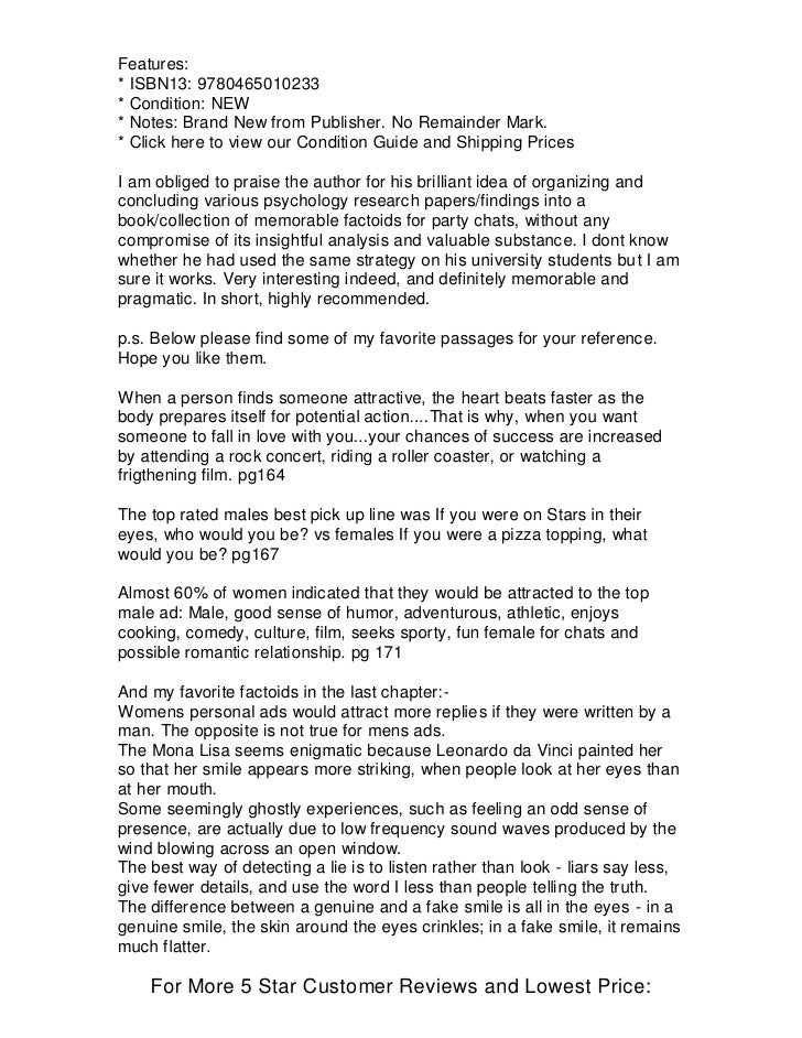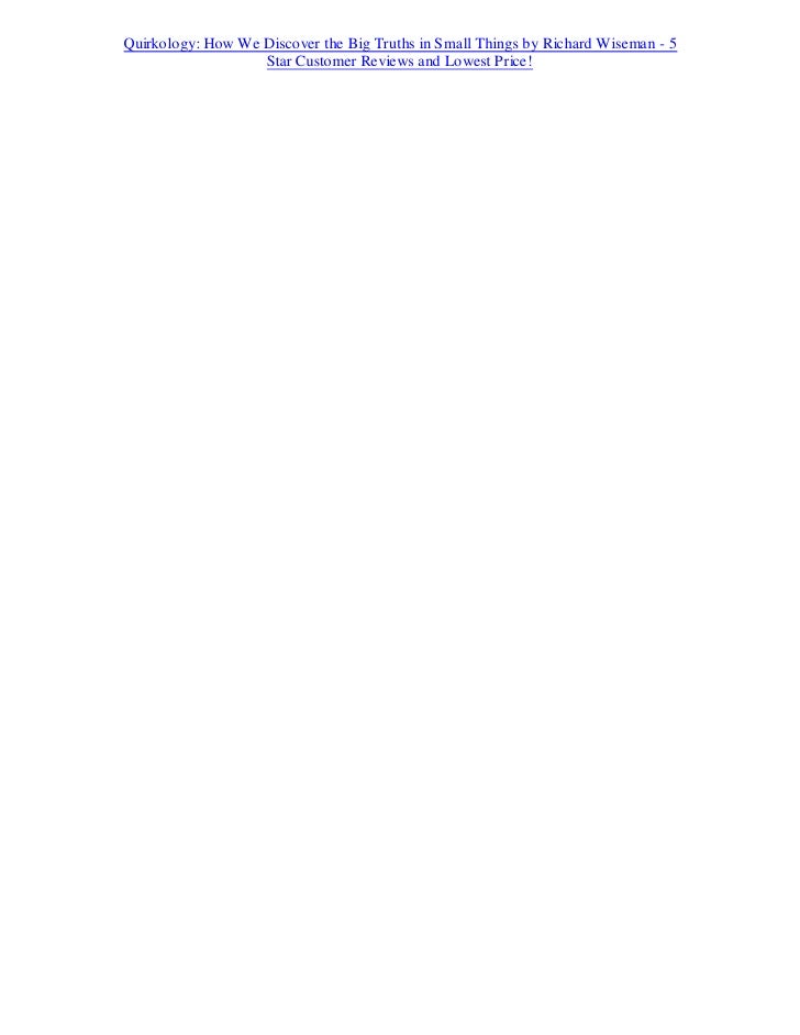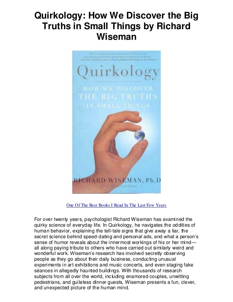 In Quirkology, he navigates the backwaters of human behavior, discovering the tell-tale signs that give away a liar, the secret science behind speed-dating and personal ads, and what a person's sense of humor reveals about the innermost workings of their mind- all along paying tribute to others who have carried out similarly weird and wonderful work . Wiseman's research has involved secretly observing people as they go about their daily business, conducting unusual experiments in art . . .