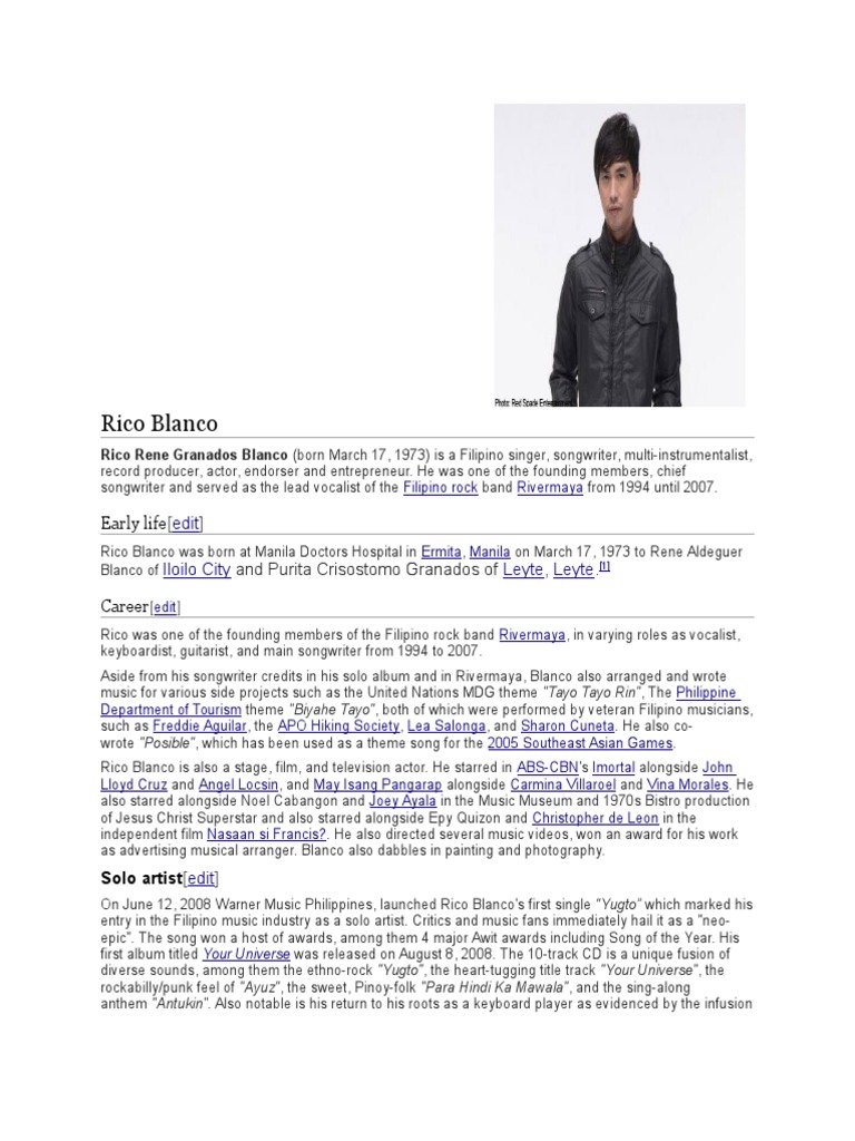 Rico Rene Granados Blanco (born March 17, 1973) is a Filipino singer, songwriter, multi-instrumentalist, record producer, actor, endorser and entrepreneur . He began his career as one of the founding members, and served as the chief songwriter, vocalist, guitarist, and keyboardist of the Filipino rock band Rivermaya from 1994 until 2007, and has been a solo artist since 2008 .