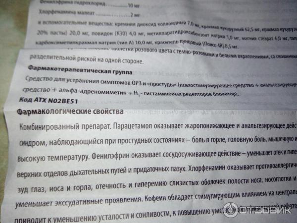 Фармакотерапевтическая группа: Средство для устранения симптомов ОРЗ и «простуды» (анальгетическое ненаркотическое средство + альфа-адреностимулятор + Н1- гистаминовых рецепторов антагонист + психостимулирующее средство) . Код ATX [N02BE71] Фармакологические свойства Комбинированный препарат .