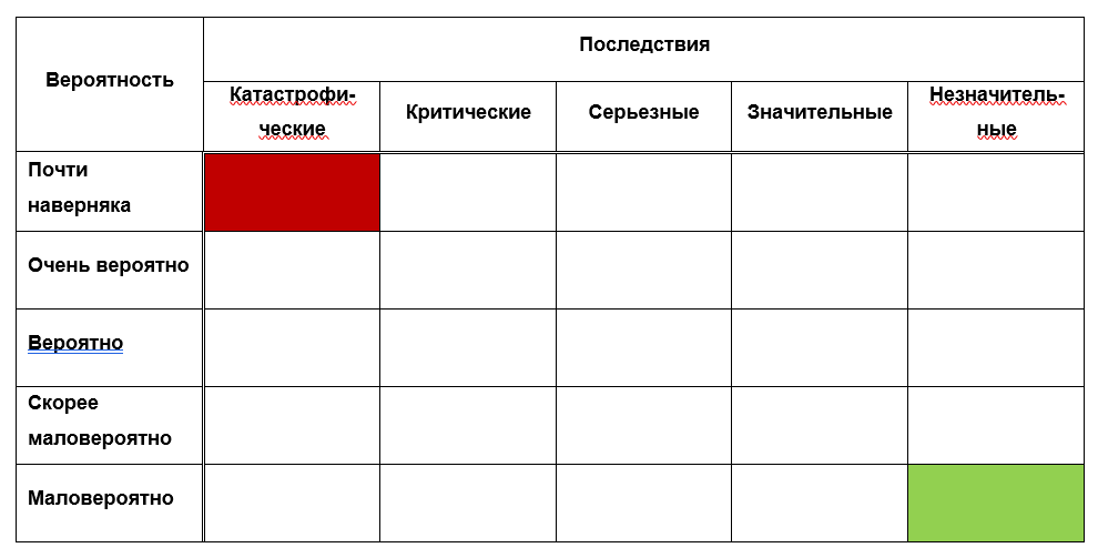 Будет ли очень вероятный риск с катастрофическими последствиями иметь такую же степень, как риск «почти наверняка» с критическими последствиями? Какая степень риска приемлема, и будет ли она располагаться в середине таблицы? Какую степень стоит приписать очень вероятному риску с незначительными последствиями?