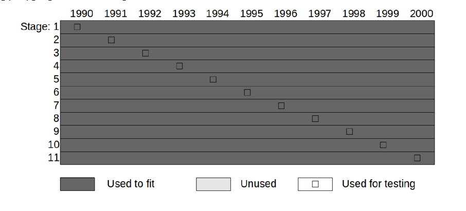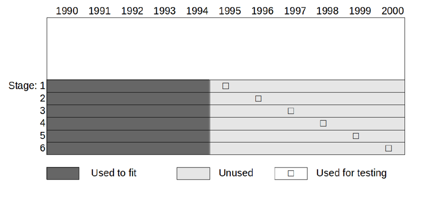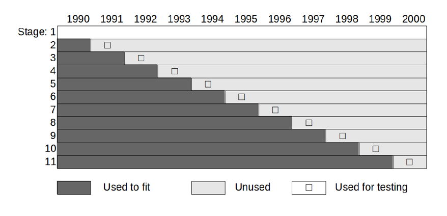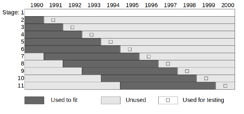 На рис. 7 это показано для примера модели, работавшей в период с 1990 по 2000 год. Каждый этап настройки занимает строку. Таким образом, первая строка показывает, что вы будете использовать все данные за 1990–2000 годы, чтобы подобрать модель, которую вы тестируете в 1990 году. На втором этапе вы используете ту же самую подобранную модель для проверки производительности в 1991 году и так далее.