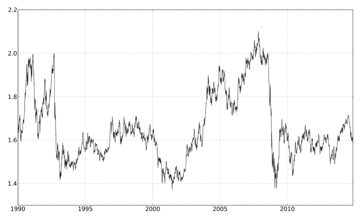 Процесс подбора будет включать в себя выбор одного или нескольких торговых правил из списка кандидатов, каждое из которых основано на блестящей идее. Давайте рассмотрим надуманный пример, но будьте осторожны, это не то правило, которое я бы рекомендовал использовать. Основная гипотеза состоит в том, что курс британского фунта стерлингов к доллару США, по-видимому, движется в диапазонах, как показано на рисунке 6. Вы можете подумать, что покупка фунтов, если они на 5% ниже их среднего значения за последний год, и продажа на 5% выше, является хорошей стратегией. Это пример правила возврата к среднему.
