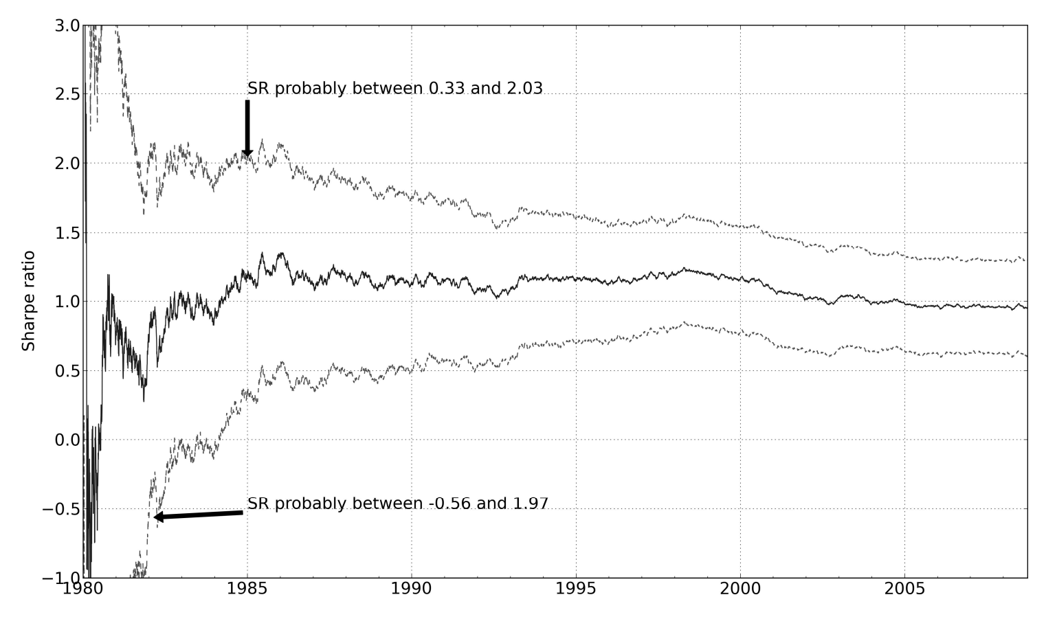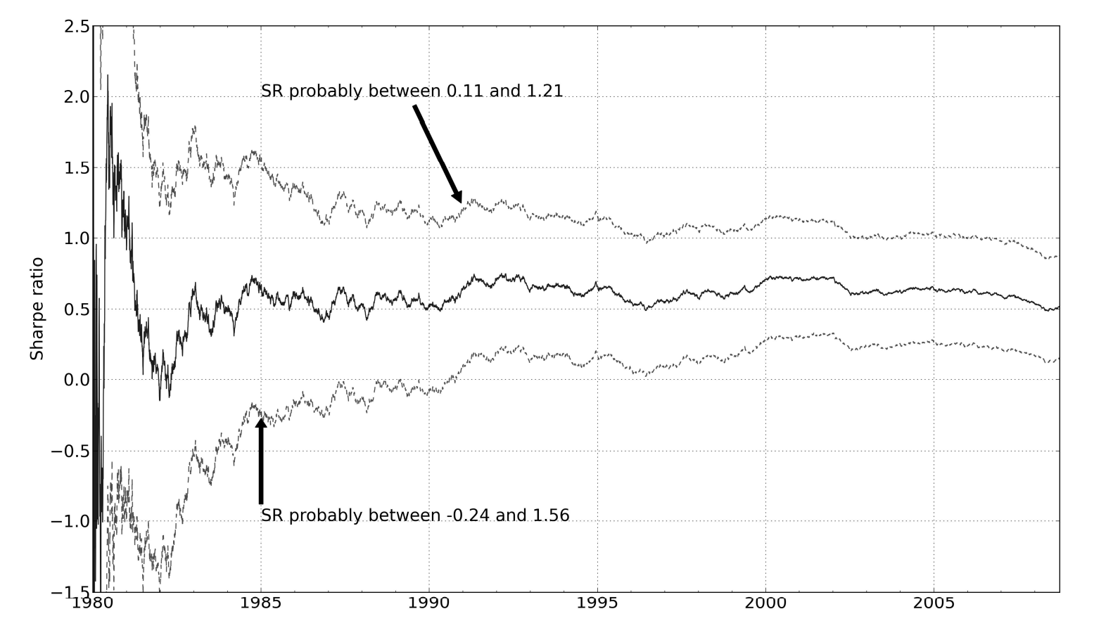 Этот тест обычно используется с порогом в два сигма. Если оценочное среднее значение SR превышает ноль более чем на два стандартных отклонения, вероятность того, что это произойдет, составляет всего 2,5%, если истинное значение SR на самом деле было отрицательным.