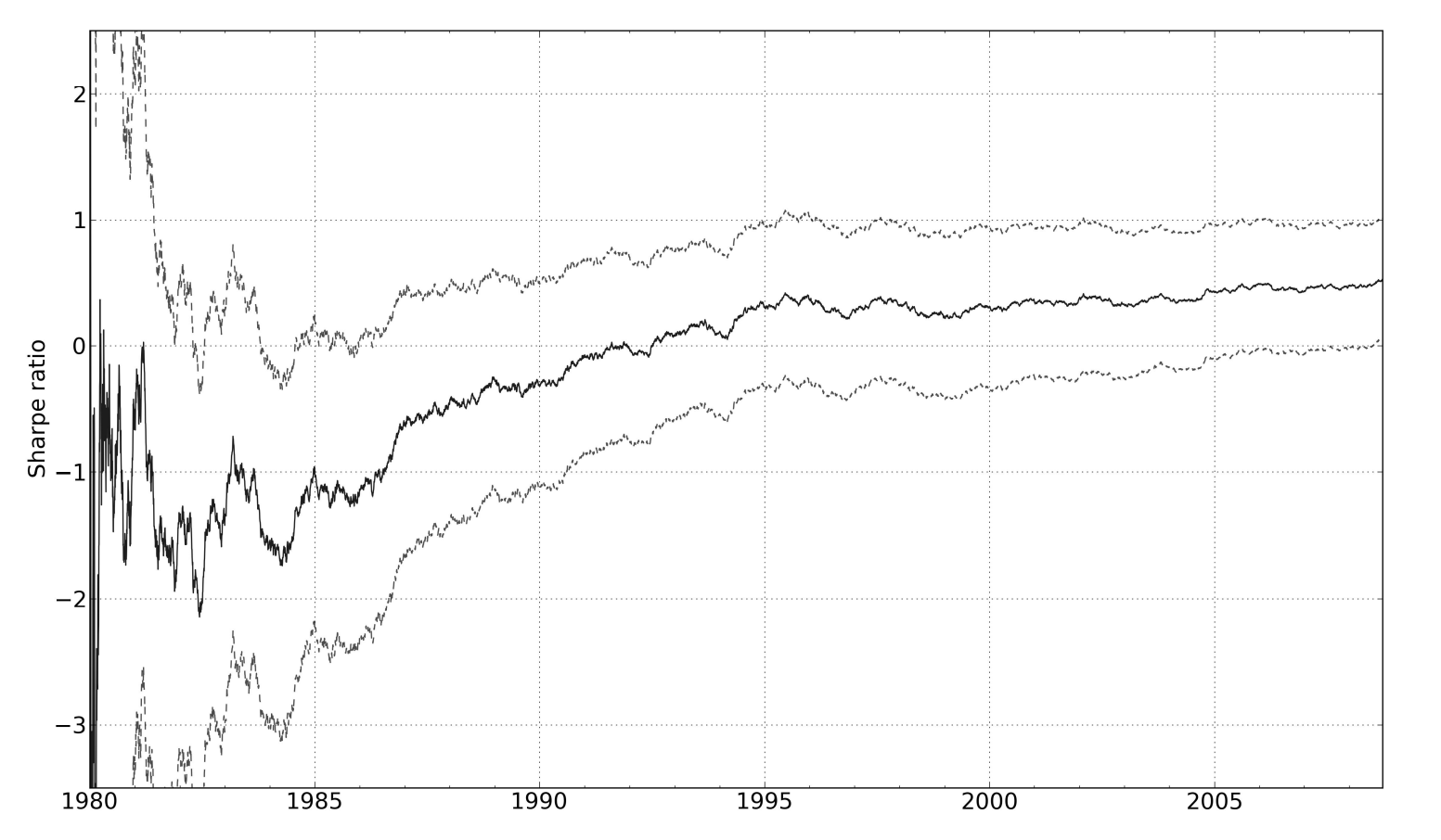На рис. 11 показана эволюция среднего измеренного SR для произвольного торгового правила и вокруг него верхний и нижний «доверительные интервалы». Каждый доверительный интервал отстоит от среднего на две сигмы, поэтому, когда нижний интервал поднимается выше нуля, я знаю, что вероятность того, что торговая система на самом деле является замаскированным убыточным правилом, составляет всего 2,5%.